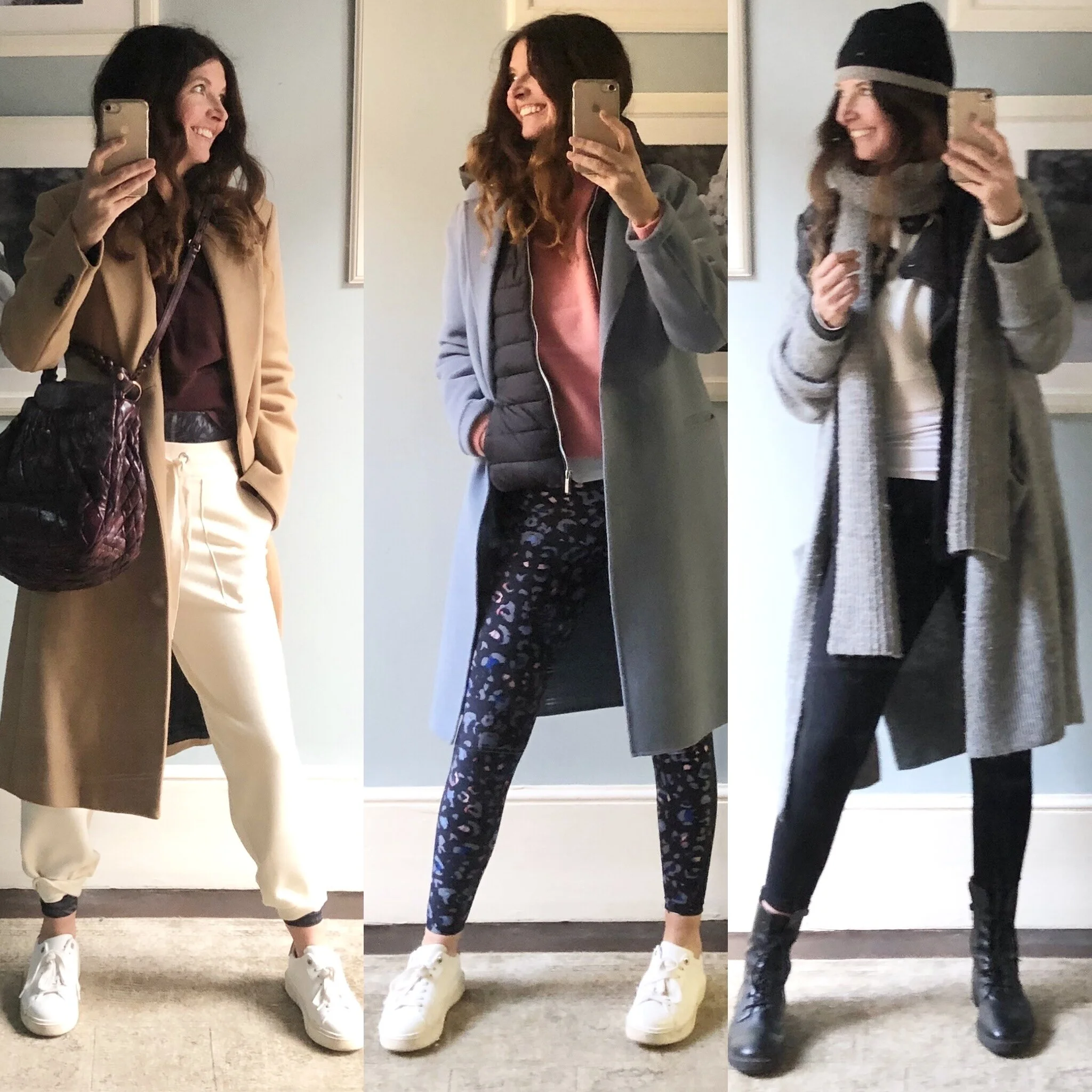 Adding layers is the secret to styling up your gym kit. Long line cardigans, coats and waistcoats will work for all shapes by showing off the lovely high waist effect of the leggings, whilst hiding your (quite) exposed behind at the same time. There is something very elegant about revealing just the slimmest part of your leg beneath a long coat /cardigan - not only that, but a chunky trainer/boot will add to the flattering effect!